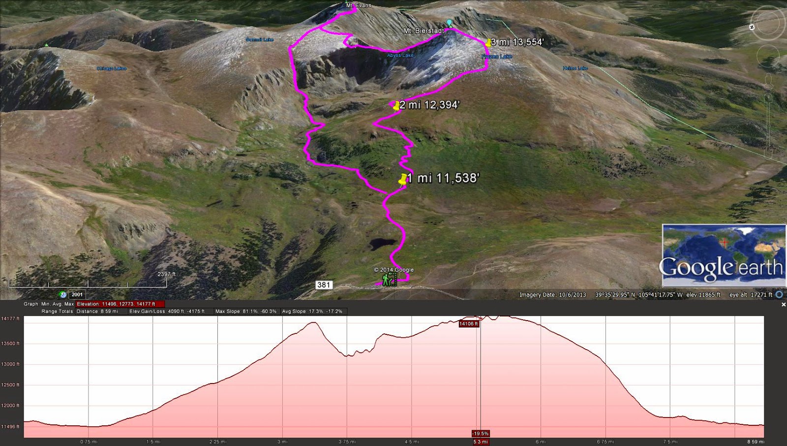This map is the Bierstadt/Evans combo...We did not tag Evans. So the line on the right is the route up Biestadt.