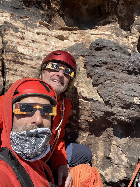 Original goal was to climb Inti Watana...however, the route is a NW facing route and the forecasted winds were projected to be whipping through the canyon from that direction...30-40 mph sustained winds...so we changed our plans for the few days, to enjoy calmer walls, warmer weather, and to avoid rope hang ups...all in all, was a great few days, and got to enjoy the Solar Eclipse from the 4 pitch of our route...